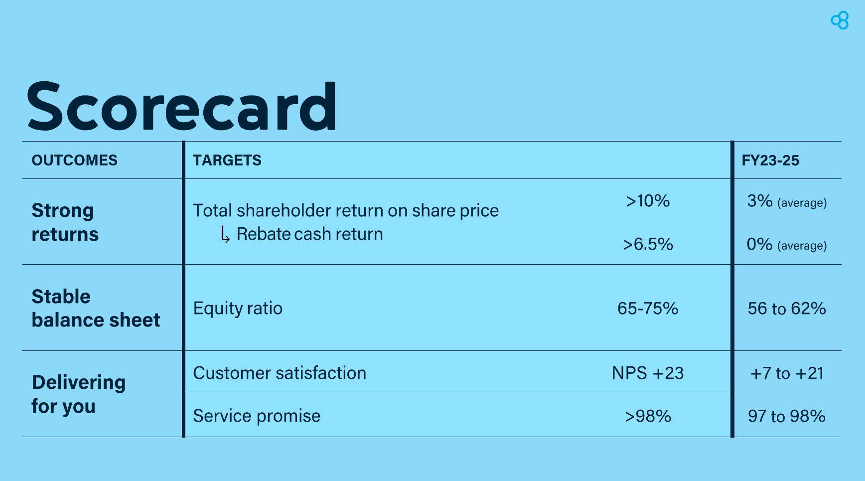 To measure its success, at the roadshows we introduced a scorecard which holds us to account on three key outcomes: Strong returns, a stable balance sheet and delivering for you.